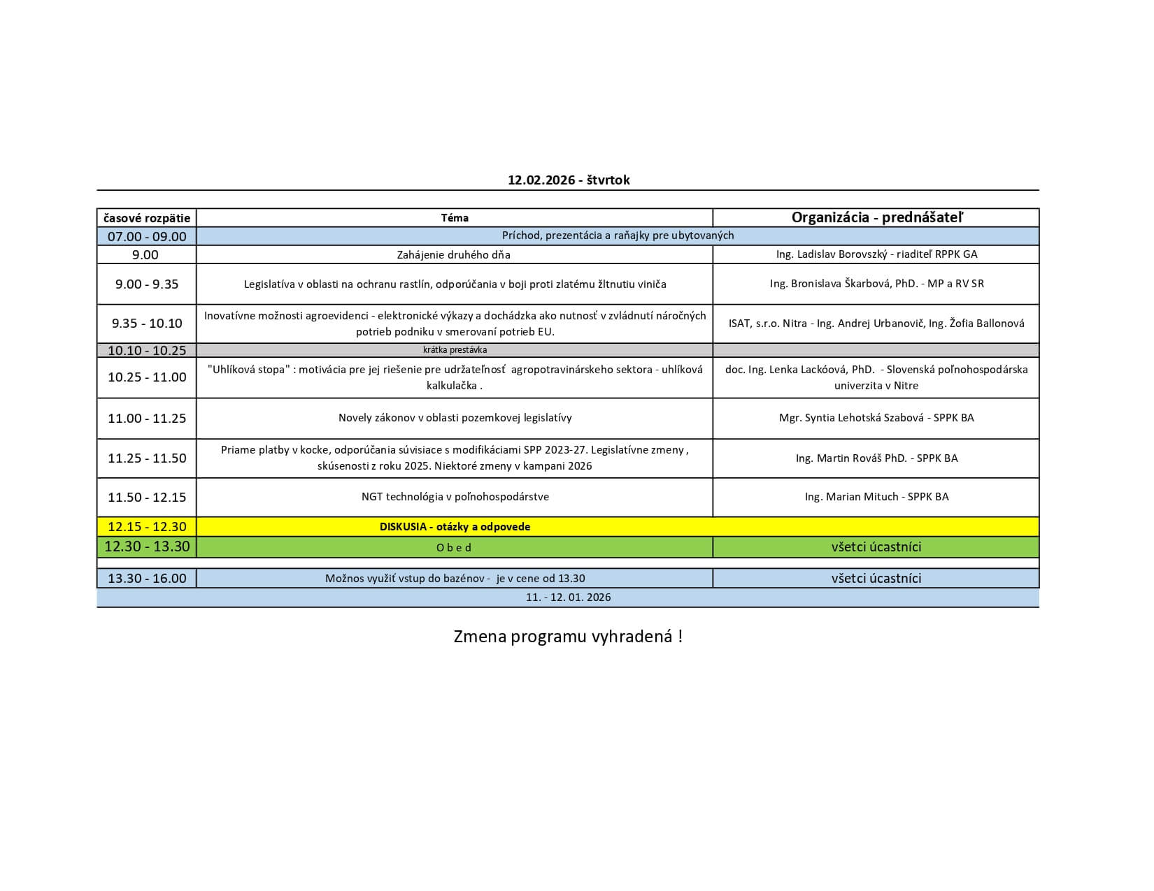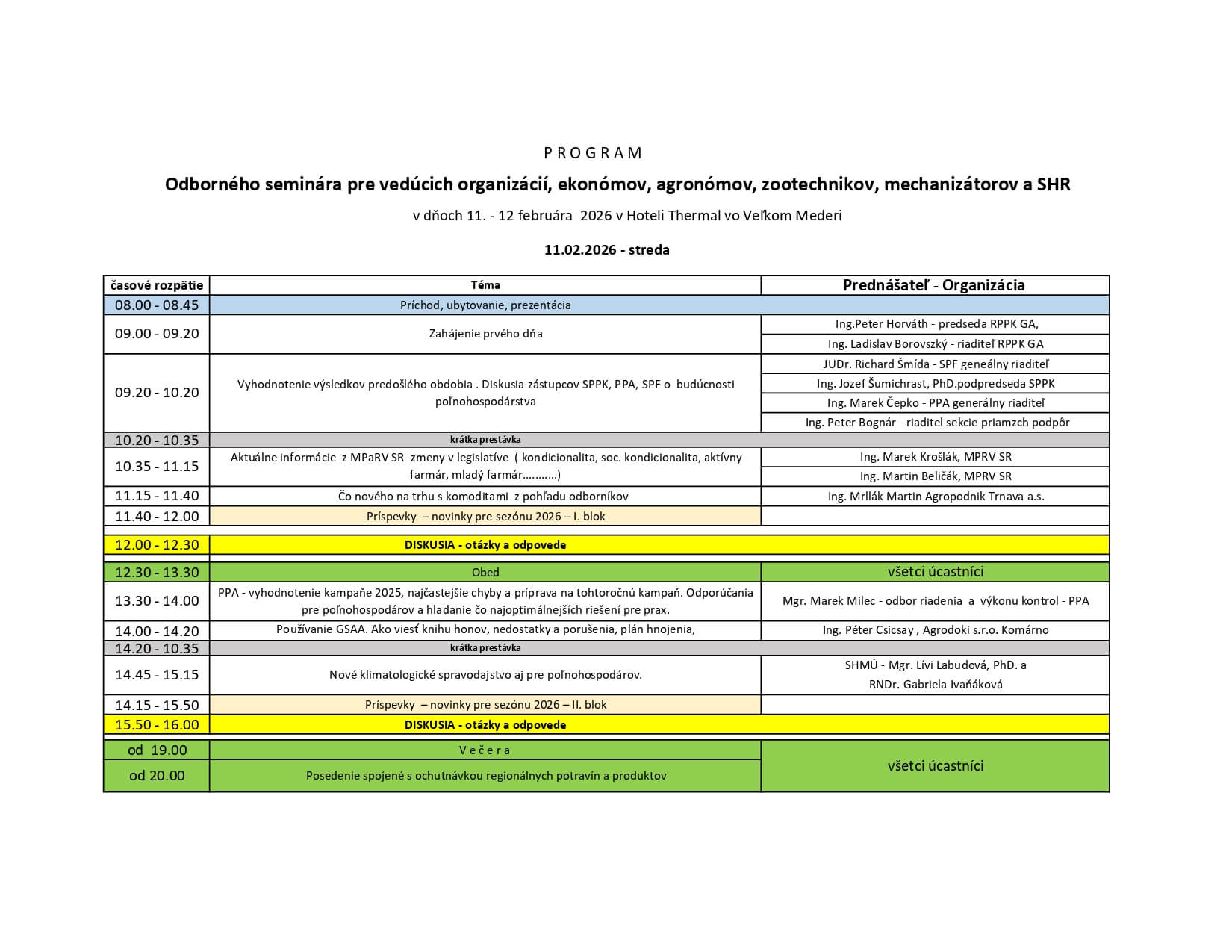 Do programu bude zaradené aj diskusné fórum zástupcom vedenia SPPK alebo poverenou osobou o aktuálnej situácii v agrorezorte, ďalej aktuálne odborné informácie, ktoré sú základom Vašich ďalších správnych rozhodnutí, ako i témy na riešenie aktuálnych úloh s čelnými zástupcami SPPK , PPA ako aj SPF a MPaRV SR.